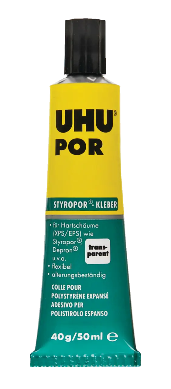 - Schnell anziehender Spezialklebstoff zum Kleben von Polystyrol-Hartschaum (z. B. Styropor®), auch in Kombination mit anderen Materialien